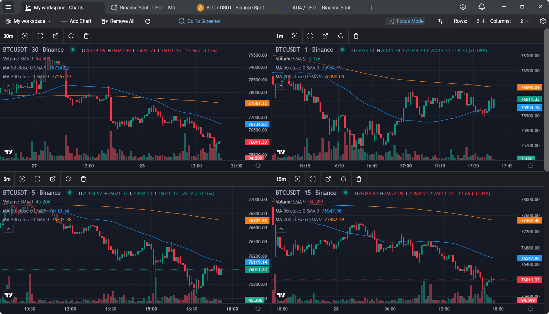 Anyone who trades seriously ends up watching more than one chart. BTC on the 15-minute and 1-hour to catch the trend, a couple of alts for rotation, maybe an ETH chart because ETH moves first. It's a sensible workflow.