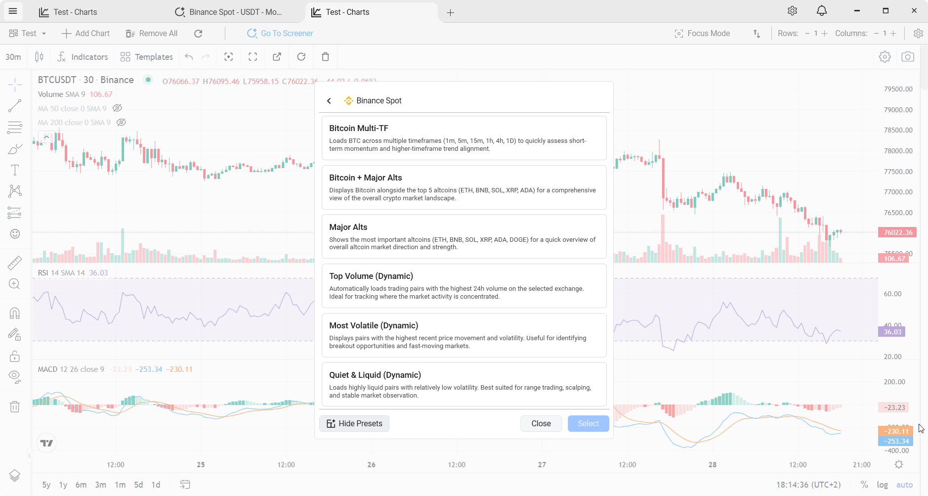Presets are a convenience, not a constraint. Six curated layouts open instantly from a menu — pre-wired with specific pairs, timeframes, and indicators, so you skip the setup when you want a known view. Three are static (fixed pairs); three rebuild themselves live from market conditions. Once opened, a preset is yours to edit: swap a pair, change an interval, add more charts, remove ones you don't need, stack extra indicators. Nothing stays locked after the click.