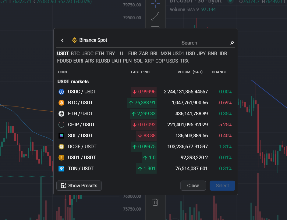 Adding a chart uses a rich popup showing the exchange logo, symbol, live last price with up/down arrow animation, 24h volume, and 24h change %. Search-as-you-type to find pairs fast — the same kind of list the exchanges themselves show.