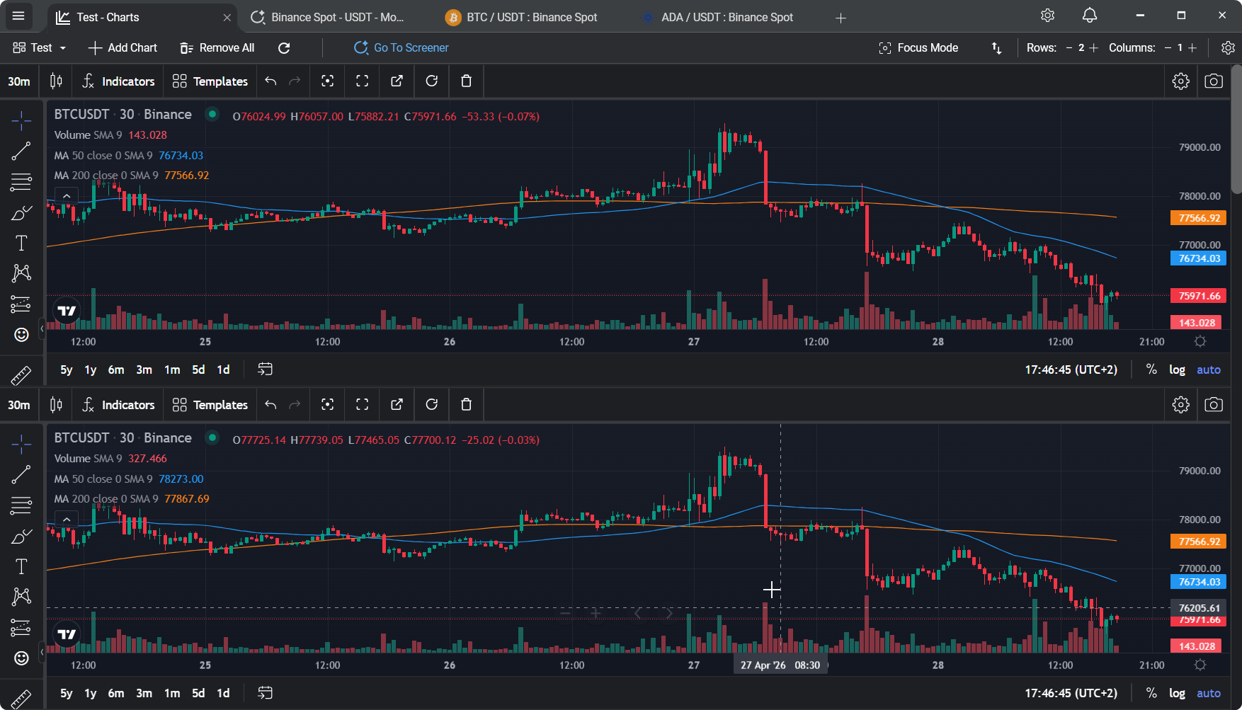 Every chart in a workspace updates independently from its own WebSocket stream — whether you're running two, ten, or more. When BTC moves first and alts follow, you see the relationship live across the whole workspace.
